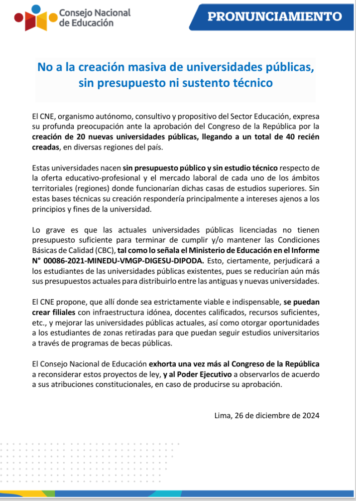 Incluso organismos serios como el Consejo Nacional de Educación (CNE) e IPAE Acción Empresarial han pedido que el Ejecutivo acuda al Tribunal Constitucional para frenar esta ley populista. “Se trata de una decisión irresponsable que condena a las nuevas universidades a la precariedad y al descrédito”, advirtió el CNE.