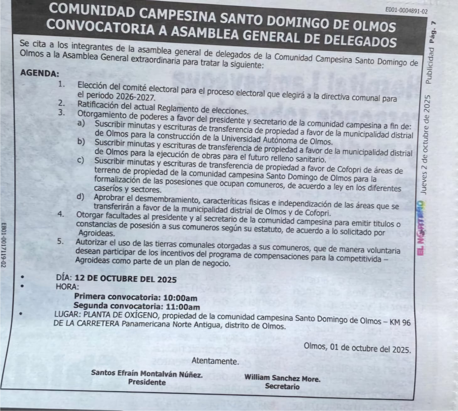 En este carnaval universitario, apareció otro conocido del populismo y charlatanería local, Santos Montalván, presidente de la Comunidad Campesina Santo Domingo de Olmos (CCSDO), quien, aprovechando la coyuntura de la asamblea extraordinaria para elegir su comité electoral, incluyó de contrabando en la agenda (para agradar a la gente), se le otorgue poderes, para avanzar con minutas de donación de terrenos comunales, a favor de la futura “universidad”.
