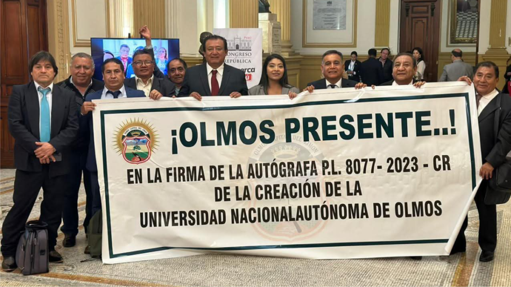 El alcalde viajó a Lima acompañado de regidores y simpatizantes, con un cartel que proclamaba: “Olmos presente en la firma de la autógrafa del Proyecto de Ley 8077-2023-CR”. Una escena digna de sátira política, mientras el país debatía la quiebra técnica del sistema universitario, el burgomaestre olmano hacía turismo legislativo, posando frente a cámaras para celebrar una universidad sin presupuesto, sin estudio técnico y sin futuro real.